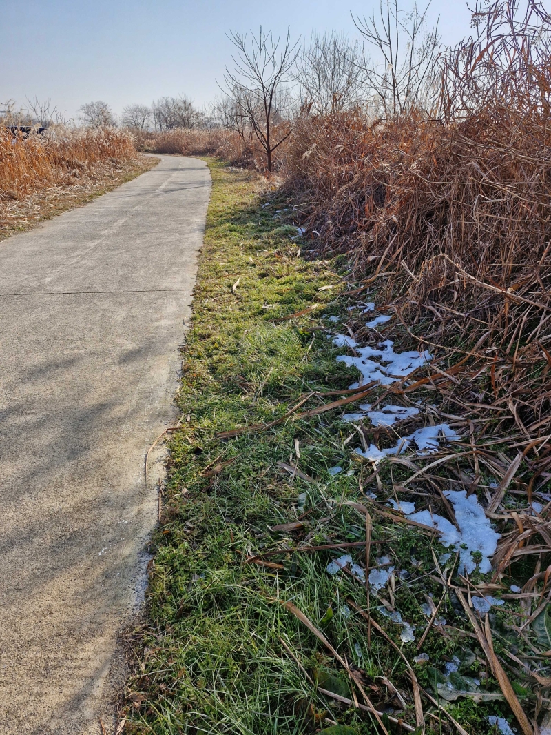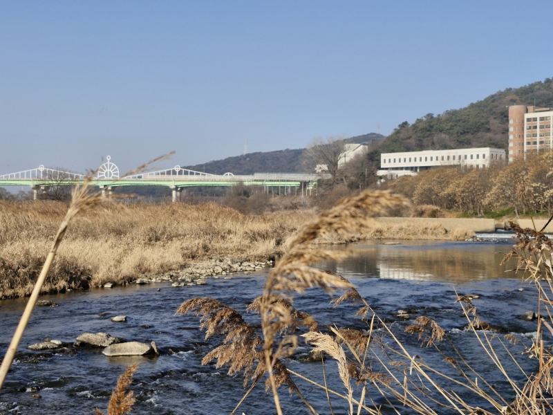 강가 둔치는 겨울 나목들과 억새 숲이 긴 행렬을 이루며 무성하던 푸르름이 사라지고 온통 회색빛입니다.