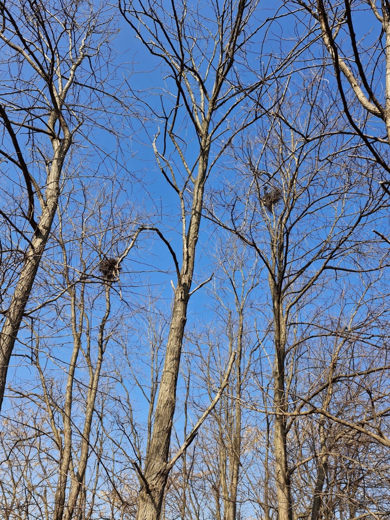 숲에서는 새들이 분주하게 날으며 끊임없이 지저귀는 소리로 가득합니다. 키가 큰 나무 우듬지에 남겨진 빈 새집이 운치를 느끼게 합니다.