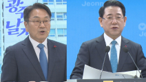 【 앵커멘트 】 내년 6월 지방선거를 앞두고 강기정 광주광역시장과 김영록 전남도지사가 재선과 3선 도전 의지를 밝혔습니다. 두 단체장 모두 이재명 정부 출범으로 지역 발전의 전환점을 맞은 만큼 시작한 일을 완성하겠다는 포부를 내놨습니다. 강동일 기자의 보돕니다. 【 기자 】 강기정 광주시장은 송년 기자회견에서 내년 지방선거 재선 도전 의지를 강하게 시사했습니다. 핵심 이유로는 '정책의 연속성'을 들었습니다. AI·미래차·반도체 등 미래산업 육성과 중증발달장애 시범사업·통합돌봄 등 복