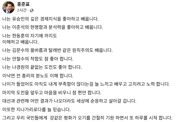 홍 후보는 29일 자신의 SNS에 "마지막 도전을 앞두고 마음을 비우니 참 편안하다"며 이같이 적었습니다.